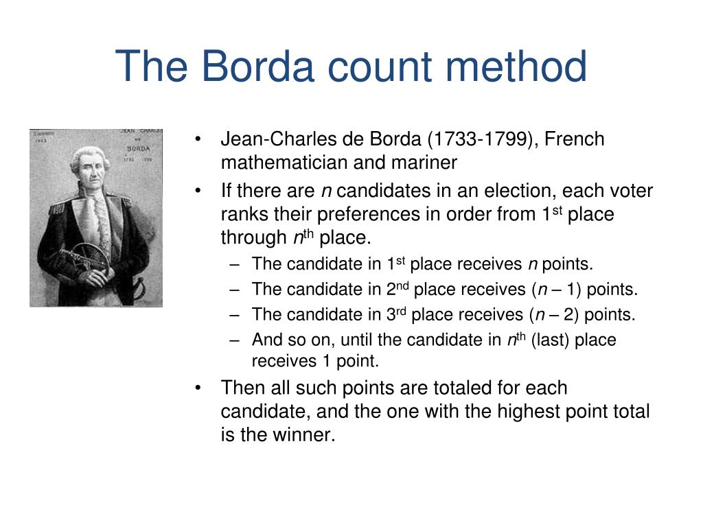 Borda Count Method Calculator / Compare and contrast the Borda count method and the purality-with-elimination method / Ghci as a hex calculator interactive:. You get an explanation (e.g., mailbox full) for emails that are not delivered and can drill down to resend them. United parcel service uses the same check digit method used on u.s. Ghci as a hex calculator interactive: Variations of the borda count method 4.3 181 200 weighted voting systems 209 excursion: Blocking coalitions and the banzhaf power index 215 kayros stud io/s h ut ter sto c chapter 4 summary 219 • chapter 4 review exercises 222 • chapter 4 test 226 om k.c 5 the mathematics of graphs 5.1 graphs and euler circuits 230 excursion: